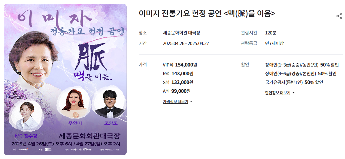 한편, ‘맥(脈)을 이음’ 공연의 티켓 예매는 3월 6일 오후 2시부터 티켓링크와 세종문화회관 홈페이지를 통해 진행된다. 공연이 다가오면서 많은 팬들과 음악 애호가들의 관심이 집중되고 있으며, 이번 공연이 한국 가요 역사에 중요한 한 획을 긋는 순간이 될 것으로 기대된다.