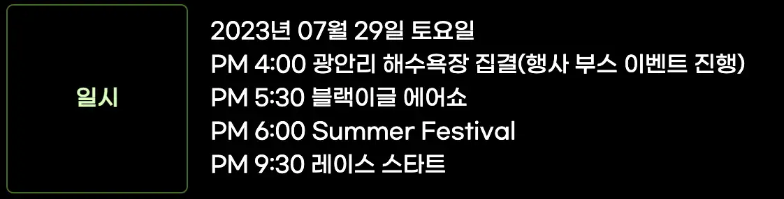 2023 부산 나이트레이스는 2023년 7월 29일 토요일에 개최될 예정으로 구체적인 일정은 다음과 같습니다. 16:00 광안리 해수욕장 집결, 17:30 블랙이글 에어쇼, 18:00 썸머 페스티벌, 21:30 레이스 스타트 순서로 진행됩니다. 순수 참가자만 20,000명이고 주말에 유동인구가 많은 곳이니 안전에 주의를 기울이셔야 합니다. 광안대교 불꽃축제처럼 전국적으로 유명한 행사가 되기를 바라봅니다.