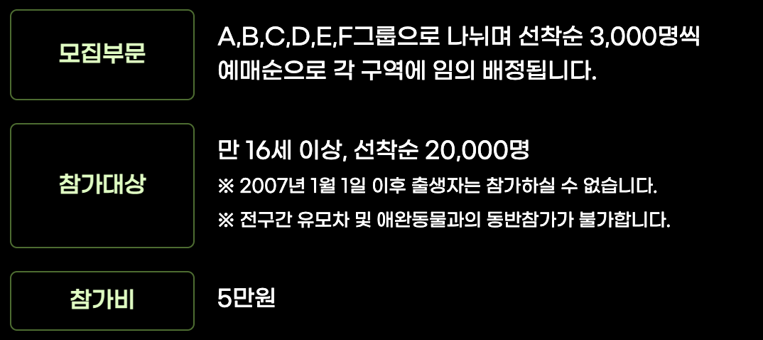 2023 부산 나이트레이스에 참가할 수 있는 연령은 만 16세 이상입니다. 2007년 1월 1일 이후 출생자는 참가 불가이니 꼭 나이를 확인하시기 바랍니다. 그리고 선착순 20,000명 참가할 수 있으며, 전 구간에 걸쳐 유모차 및 반려동물의 동행이 불가합니다. 이번 행사에서는 A, B, C, D, E, F 그룹으로 나눠 선착순 3,000명씩 예매 순으로 각 구역에 임의 배정되고, 참가비는 5만 원입니다.