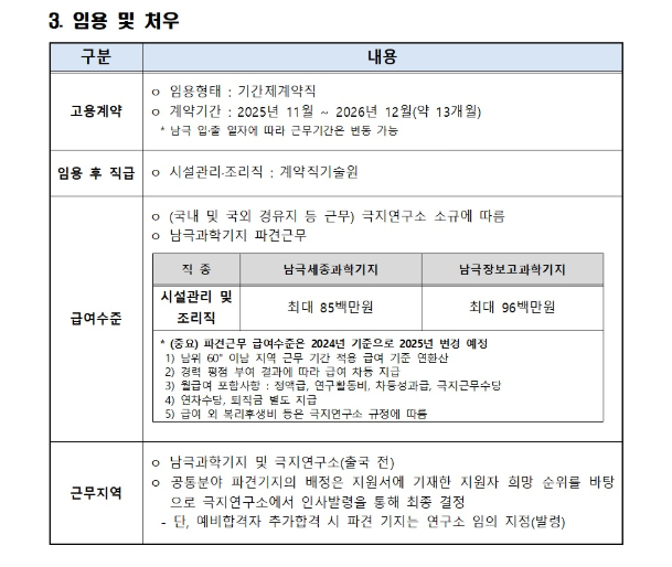 - 해당 근무지(남극 과학기지)에서 근무가 가능한지 반드시 확인 후 지원 바랍니다.
