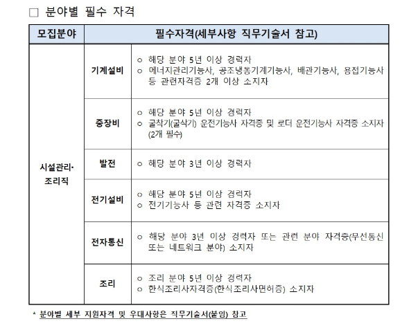 - 5년 이상 경력 및 관련 자격증(에너지관리기능사, 공조냉동기계기능사 등)